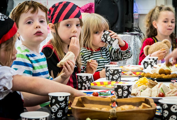 Activities: Put out arts and craft supplies, including long foam pieces, so kids can create their own swords and eyepatches (make sure there's an adult around to help with the fitting). Have kids walk the plank—set out cardboard "plank" and let them jump into a foam pit or baby pool. Kids can also create their own pirate names, do a backyard treasure hunt, and play capture the (pirate) flag!