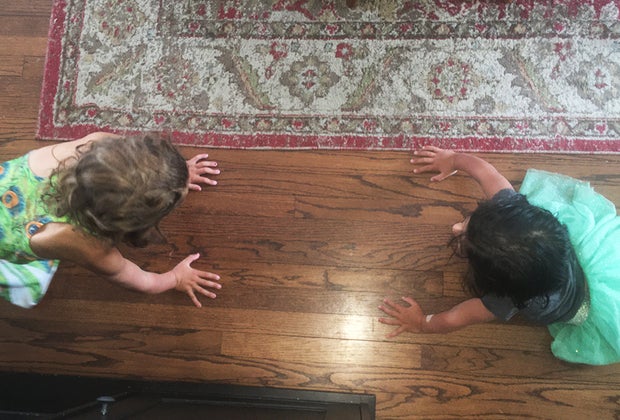 Each child should get into the push-up position across from one another. Make sure they can touch hands when their arms are extended. After each push-up, the kids hit hands and run through the "Pat-A-Cake" song. Switch hands each time like you would during the song. Don’t forget to try and roll your arms like in the song.