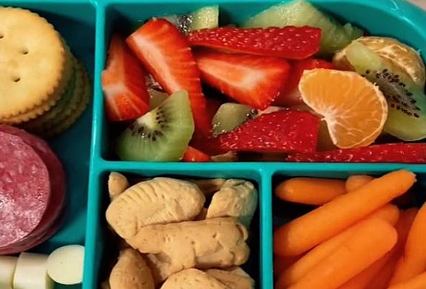This one has it all: fruit, veggies, grains, protein, and a sweet crunchy treat. This mom packs a colorful, tasty lunch that will give her child enough energy to make it through that day.