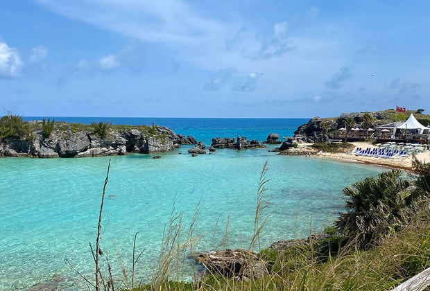 Perhaps the most iconic pink-sand beach on the island, Horseshoe Bay Beach truly has it all—shallow areas for kids, turquoise water, chair and umbrella rentals, a beach-side bar, and nearby hikes with incredible views. Naturally it's one of the most popular stops in Bermuda, but you may still find it uncrowded, especially on the shoulder seasons. After arriving on our Norwegian Cruise Lines ship from Boston, we used the St. George's and West End Mini-bus Service Beach Shuttle to get to Horseshoe Bay, which was fast, friendly, and convenient for transport from the Royal Dockyard.