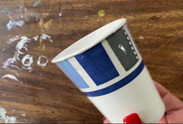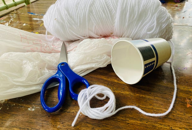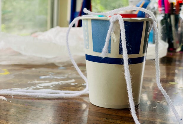 Thread one end of a piece of yarn through the hole in the plastic cup and tie the yarn to the cup with a knot. Repeat with all four strands of yarn in the remaining holes.