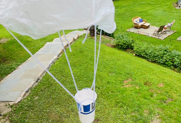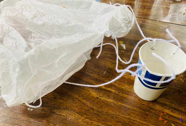 Experiment with putting different objects into the paper cup and see how that affects the parachute's flight time. Do you think it will fall faster or slower?