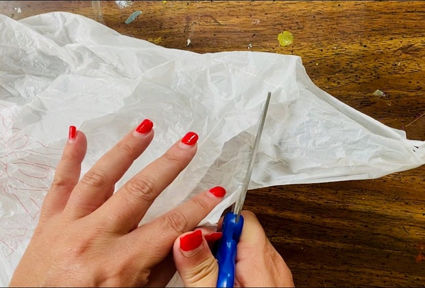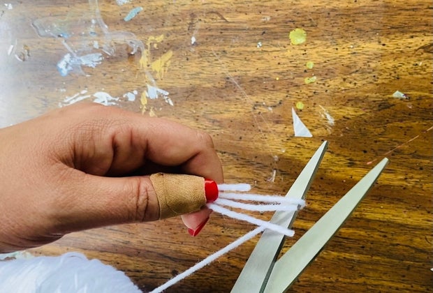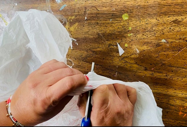 Thread the other end of the pieces of yarn through the hole in the plastic bag and tie a knot.