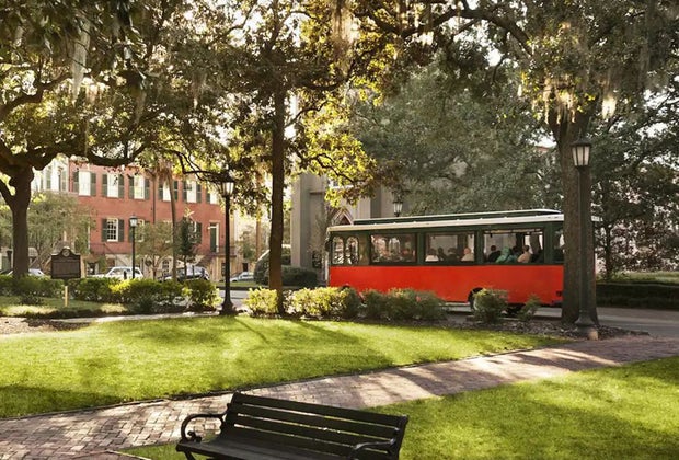 Learn fun facts from local guides on one of Savannah's popular trolley tours. Photo courtesy of visitsavannah.com