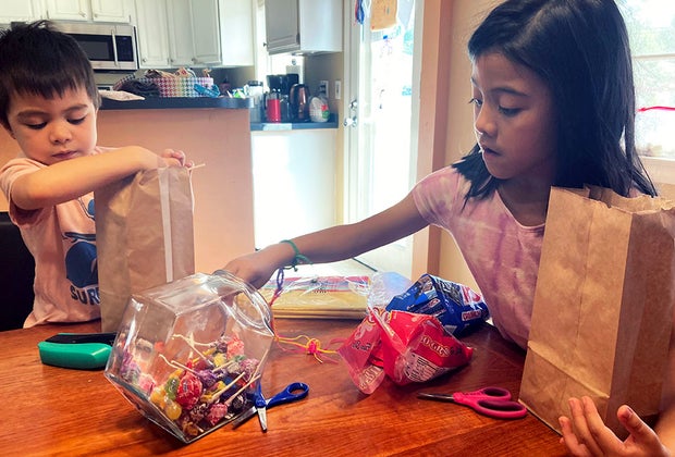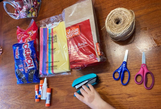 Start with the best part—the candy! Be sure to fill the bag only about halfway.