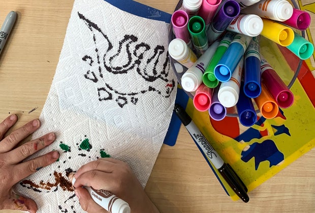 Collaborate with your toddler by prepping the permanent-marker drawing ahead of time and having them add the washable marker on the inside. Toddlers can also take the abstract route, making washable marker scribbles appear behind permanent marker scribbles, still creating an awesome effect.
