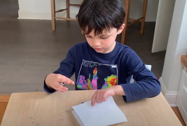 Unfold the paper towel and draw with washable marker on the bottom layer, using the marks that went through as a guide. You can color in the outline or add new shapes to the design. Note that whatever you draw in washable marker will become blurry when dropped in water, so no need to be too precise.
