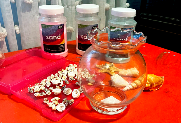 Buy a plastic bin and fill it with local sand. Add fun sequins, seashells, fine glitter, rocks, and driftwood. Get really fancy and buy a bin that has two sections. Use one for the sand mixture and one for water. Throw in some sea-creature toys for even more fun.