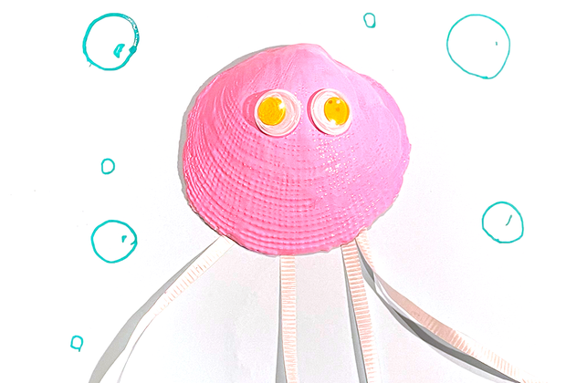 You will need a scallop shell, pipe cleaners, googly eyes, glue, and Model Magic clay for this craft. First, paint the shell whatever color you want your crab to be. You can use glue to stick the pipe-cleaner legs on, or use clay to make it a little less messy (simply place the shell over the clay and trim the excess, then poke the legs in). Finally, add the googly eyes.