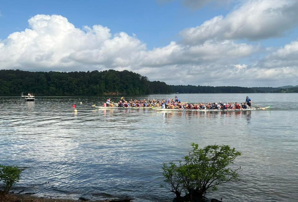 Spectators watch a cool boat race (in which the boats all look like dragons!) and enjoy food and fun.