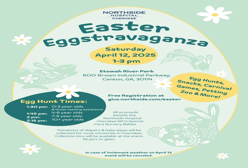 Head to Etowah River Park in Canton for Northside Hospital Cherokee's Easter Eggstravaganza. There will be four scheduled egg hunt times (organized by age groups), as well as a petting zoo, carnival games, food, and fun.