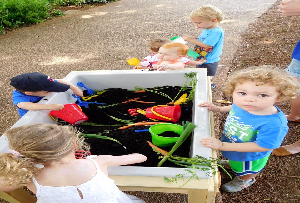 Parents connect with their little ones under shade trees on the Great Lawn to dive into nature. Garden staff lead the group in artistic activities.