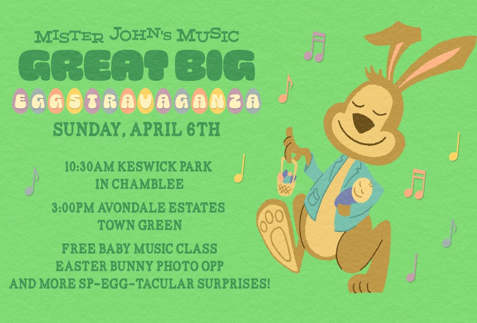 The Easter Bunny and Mister John are hopping into town for a magical, musical day of fun for families with little ones! Join on Sunday, April 6 for a free baby music class and other sp-egg-tacular surprises, plus an opportunity to take a photo with the Easter Bunny!