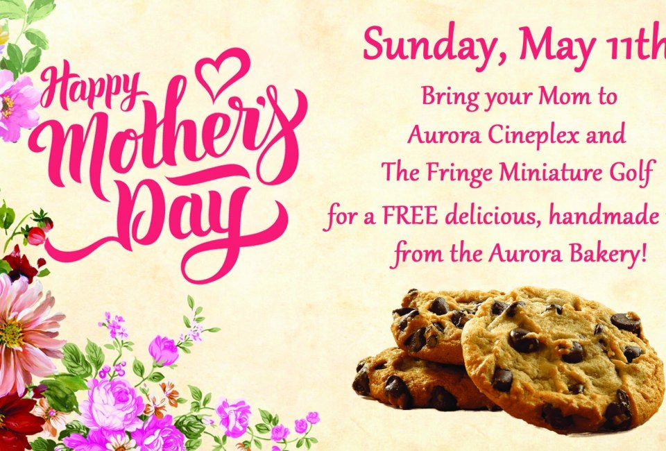 Moms gets a free Aurora bakery treat on Mother's Day. Aurora will be open 10am-8pm for movies, and mini golf on Mother's Day.