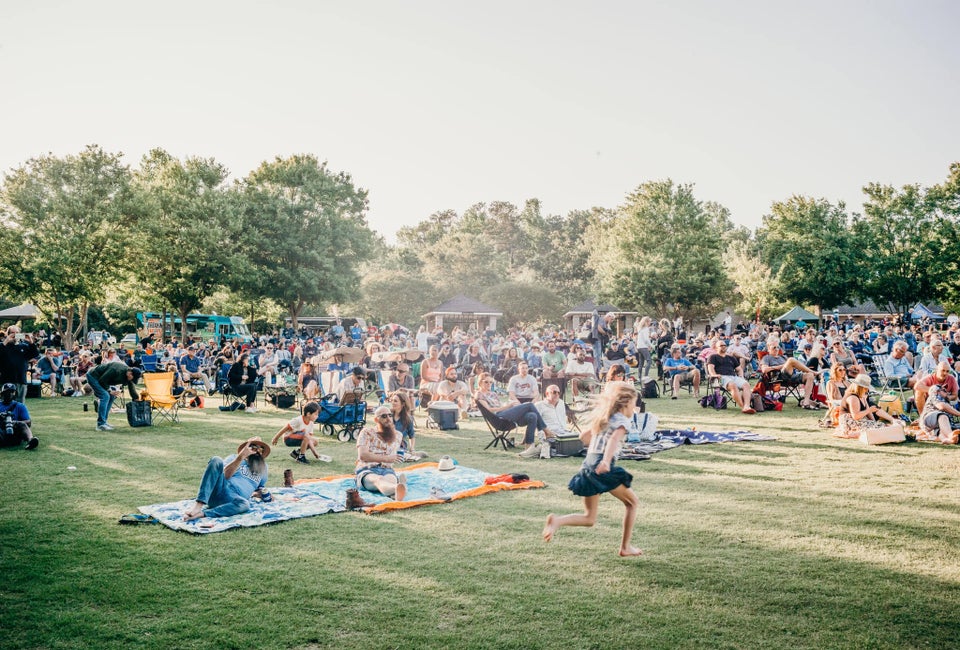 Visitors bring blankets and chairs to Roswell's Riverside Park along the Chattahoochee for free concerts the fourth Saturday of each month, April - July. Families enjoy music, food (their own or from a food truck), and the nearby playgrounds.