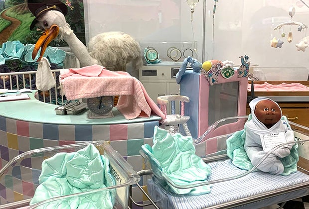 Entering the hospital, guests are greeted by a nurse and given courtesy paper nurse hats. The corridor passes by a glass encased nursery, where a Cabbage Patch Doll nurse oversees the babies in their incubators.