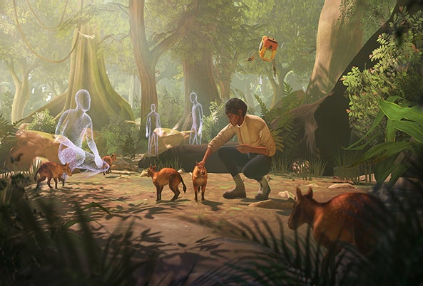 This VR experience is designed for ages 8 and over. Visitors spend 45 minutes virtually marveling at the beauty and richness of early life on our planet. Families explore the depths of oceans and tropical forests; great geological periods that span the first awakenings of life; the emergence of diverse animal species and dinosaurs; and the appearance of humans.
