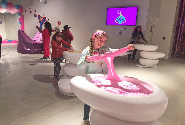In this exhibit, Sloomoo Institute visitors can help build a slime wall by adding their own slime to towering walls covered in the sticky stuff. Beyond learning how to create slime bubbles, kids also enjoy using various props to see how slime reacts; my daughter was obsessed with squeezing blue slime through a tennis racket and watching the matter drip through the strings. Visitors can also slingshot slime (with the help of trained staff) aimed at their targets standing behind plexiglass.