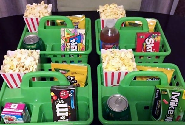 Save yourself the constant up-and-down of serving kids and give them all of their snacks up front. We're talking candy, popcorn, and a drink; maybe add a hot dog and chips to keep kids full — all nestled in a handy container. We like popcorn tins or caddies with compartments. Personalize them with movie ticket name tags.