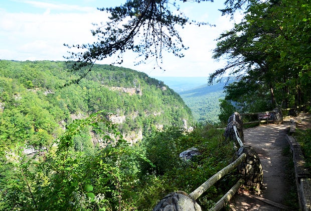 Located in the northwest Georgia mountains, panoramic vistas abound at Cloudland Canyon. Start with a picnic overlooking the rim at the main parking area, then take the 1-mile Overlook Trail offering families an easy path with plenty of opportunities for pictures. If you want to see a waterfall, take the first part of the Waterfalls Trail just a half-mile to the base of Cherokee Falls. Sit on the huge boulders, put your feet in the water, and relax. Those with more endurance can continue to Hemlock Falls deeper in the canyon but will have to climb at least 600 stairs back up.