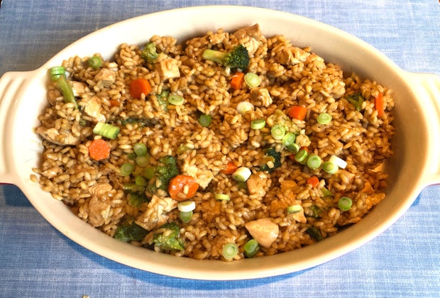 Dicing protein and vegetable pieces into uniformly small pieces goes a long way in making them more palatable to kids. There are many variations of this recipe across the internet, but I've found that many overdo it on the teriyaki sauce (making it too salty) or water (making it too mushy). This balance works for us.