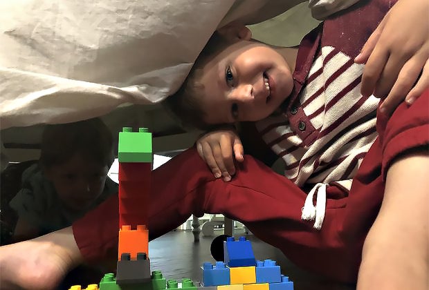 Some of my kids' favorite afternoons have been spent reading or playing with blocks underneath my king-size comforter draped over the kitchen chairs. Any blanket and table will do for an instant fort. Add some pillows and couch cushions for comfort, and the kids will disappear for hours.