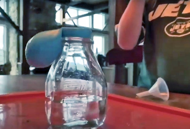 Stretch the top of the balloon securely over the top of the bottle. The weight of the baking soda in the balloon will cause it to hang over to the side.