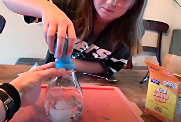 Note: The smaller the opening of the bottle, the smaller the amount of carbon dioxide can get through to the balloon and the more gradually the balloon is filled. We used a bottle with a wide mouth which allowed a greater amount of carbon dioxide to shoot up into the balloon at a much faster rate (hence the need to hang on!)