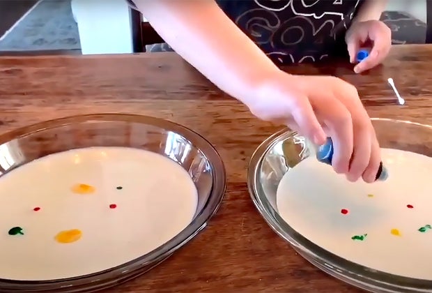 A shallow bowl or pie dish, food coloring, milk (we used both 1% and half-and-half to compare results; use what you have), a couple of drops of liquid dish soap, and a cotton swab.