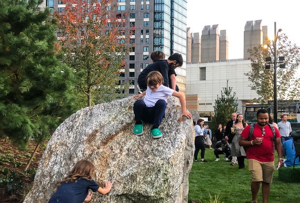 Large boulders act as climbing structures for the little ones when visiting The Rocks at Harbor Way. Photo courtesy of Mommy Poppins