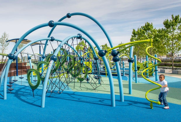 Phase 2 openings include playgrounds, like this one in Thomas Menino Park. Photo courtesy of Landscape Structures Inc.