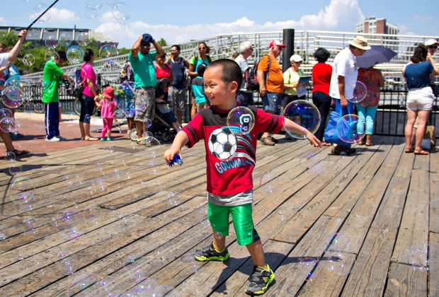 Bubbles blow in the breeze at Harborwalk. Photo courtesy of Boston Harbor Now