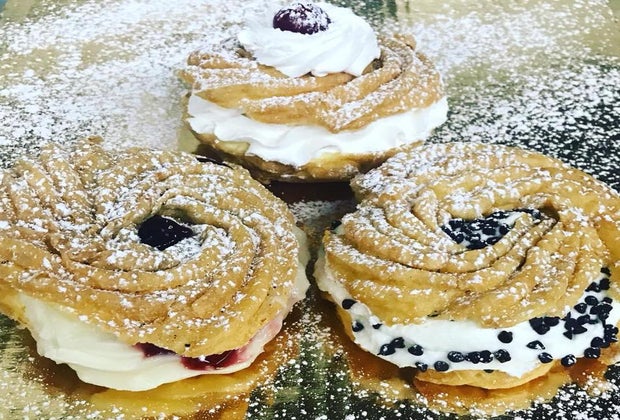 Yellow cream-filled, cherry, chocolate chip, and more...zeppole of every flavor will fill the pastry cases across town on St. Joseph's Day in March. Photo courtesy of Mike's Pastry/Facebook