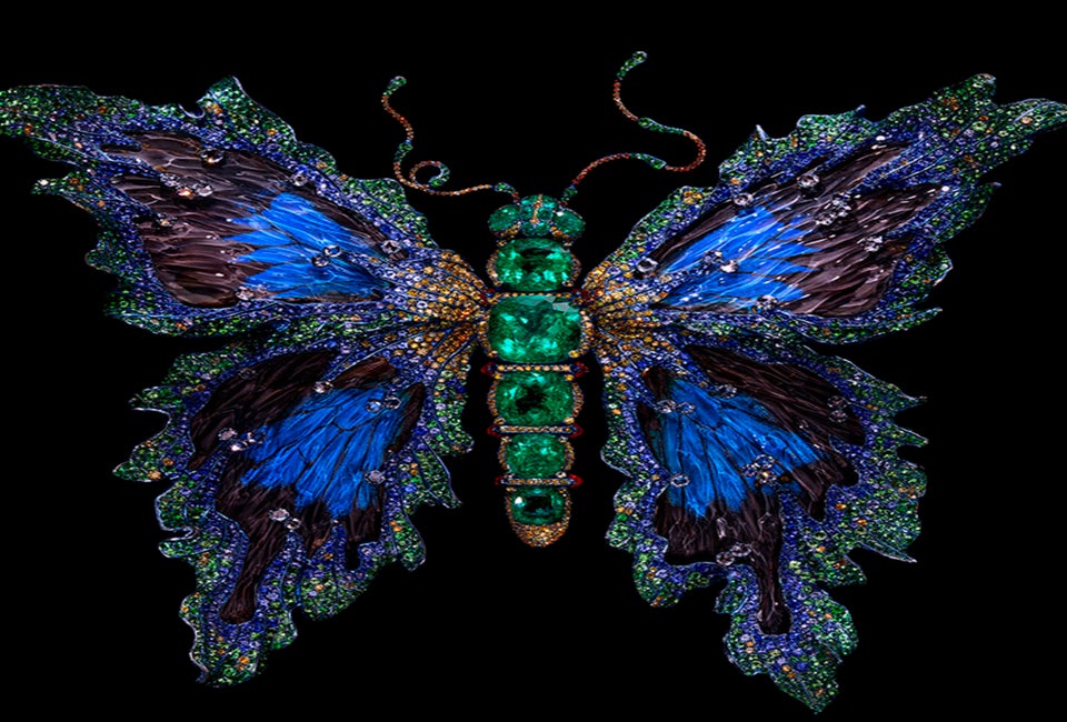 Photo: Metamorphosis. Brooch created by Wallace Chan. Emerald 16 pcs 52.44 tcw. Diamond, Ruby, Amethyst, Citrine, Blue Topaz, Crystal, Butterfly Wings, Mother of Pearl, Tsavorite Garnet, Sapphire, Yellow Diamond, 18K. White Gold, Titanium. On loan from George and Sherry Huang Collection