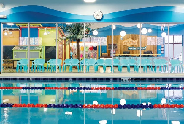 The only part of Goldfish Swim School that wasn’t designed specifically for kids was designed specially for parents. Forget sitting in a pool-side folding chair. Moms and dads can make the most of air-conditioned viewing galleries equipped with free Wifi, where they can relax, work, read, socialize, and watch their kids swim.