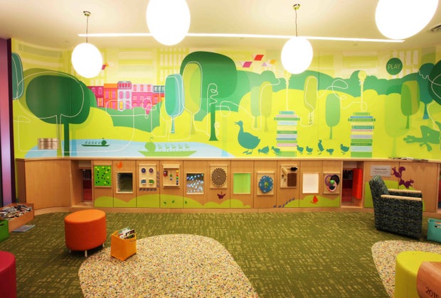 Manipulative toys line the wall to allow many kids to play at once, and there are even tunnels to explore. Photo courtesy of the Boston Public Library