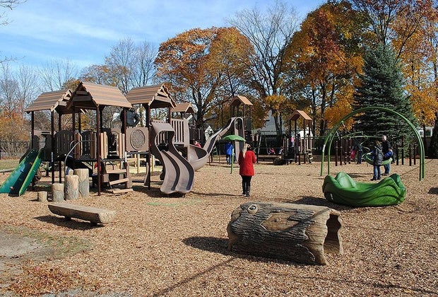 Carefully designed to replicate a woodland forest, this large playground, refabbed in 2013, is a local fave. Kids can scramble across "rocks" and "tree limbs"," swing around green "vines," and even come face-to-face with a little replica raccoon in one of the structures’ nooks and crannies. Unlike many nature-themed playgrounds, the faux-wood surfaces are quite realistic, and a welcome scene in the middle of a busy town block.