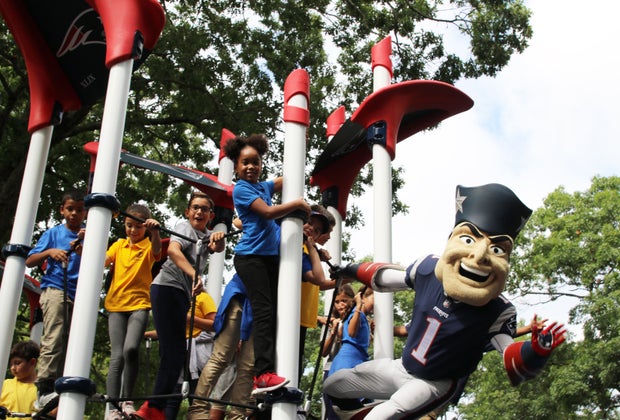 Pat Patriot greeted newcomers to the Fall River playground in the fall. Photo courtesy of the New England Patriots