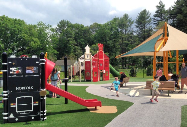 Got a little mayor on your hands? This adorable Metrowest playground is a mini-me version of Norfolk center, with play structures replicating the local train, schoolhouse, and even the historic Grange hall church. Like all respectable towns, this one has restrooms (portable potties, but we'll take 'em).