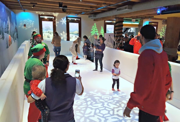 How can you possibly skate without biting temperatures and fear of falling on ice, you ask? By skating in your socks, of course! This winter-themed exhibit includes an indoor "skating rink," an enclosed oval-shaped area with a smooth, white floor perfect for sliding around in socks. There's festive music playing and snowflake lights dancing around the rink, not to mention a few museum staff members in elf attire encouraging and twirling with skaters on the rink.
