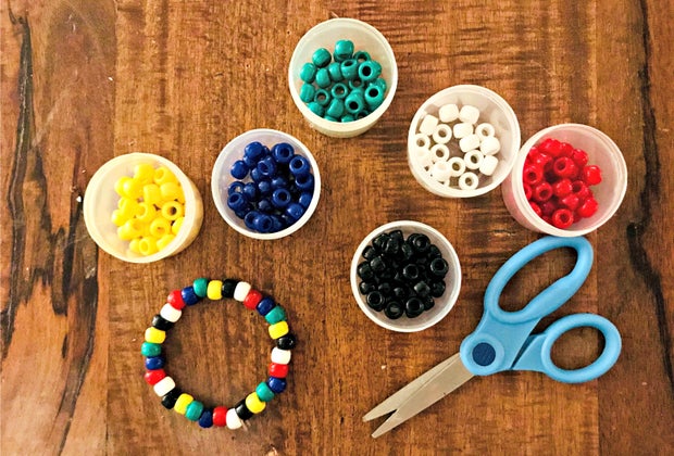 8. Set out an assortment of pony beads in Olympic-themed colors, some stretchy beading string, and safe scissors. Kids can make black, red, green, blue, and yellow beaded bracelets to wear through the Olympic season.