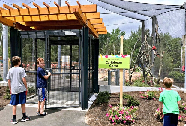 One thing we've always appreciated about Stone Zoo is the leafy, nature-inspired feel of it—including the animals' homes, which are especially well-designed to mimic their natural habitats. The new welcome plaza keeps with that aesthetic, with a spray of beautiful plants and a wood pergola roof leading into the zoo. And just steps after paying our visitors' fee, we encountered the equally unique entrance to the Caribbean Coast exhibit. Because it's a walk-through aviary, you access it through a door (with thin metal grills so that it's transparent), which really made my children feel as if they were entering the animals' habitat—going "beyond the fence," so to speak. We'd never seen anything like it. "Are we actually able to go in there? How cool is this?" said my 10-year-old.
