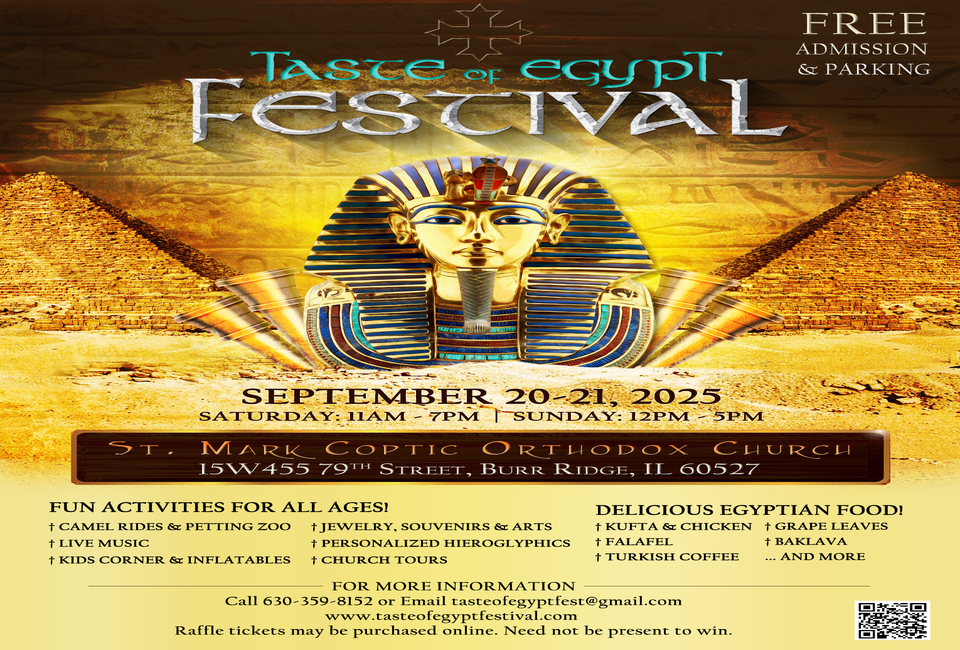 St. Mark Coptic Church of Burr Ridge invites families for its annual Taste of Egypt Festival! Enjoy camel rides, bouncy houses, inflatables, a petting zoo, church tours, live music, henna tattoos, a craft corner, jewelry, souvenirs and personalized hieroglyphics. Egyptian food will also be available for purchase, including kufta, grilled chicken, grape leaves, falafel, baklava, Turkish coffee, and Egyptian fruit drinks.
