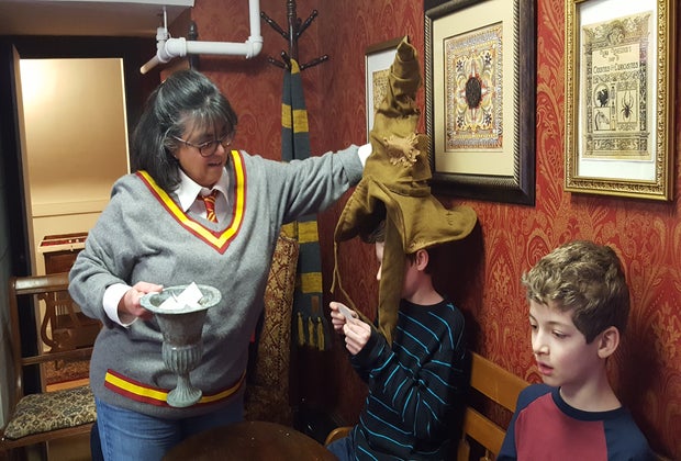 The inside of the house is amazingly decorated. The Jules Verne Library is so steam-punk, but right across the hall, the Jane Austen Regency Salon (dining room) is a great place to sip a cup of tea. Upstairs you can step into the Fairy Room or tip-toe past Harry Potter's under-the-stair bedroom.