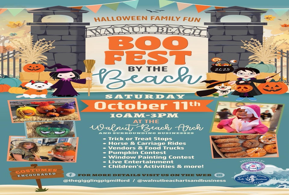 The Giggling Pig's newest event, the NEW Family Friendly Boo Fest by the Beach. The event will be held at the Walnut Beach Green (under the Arches) and there will be children's activities, horse drawn hayrides, trick or treating, a pie eating contest and more!