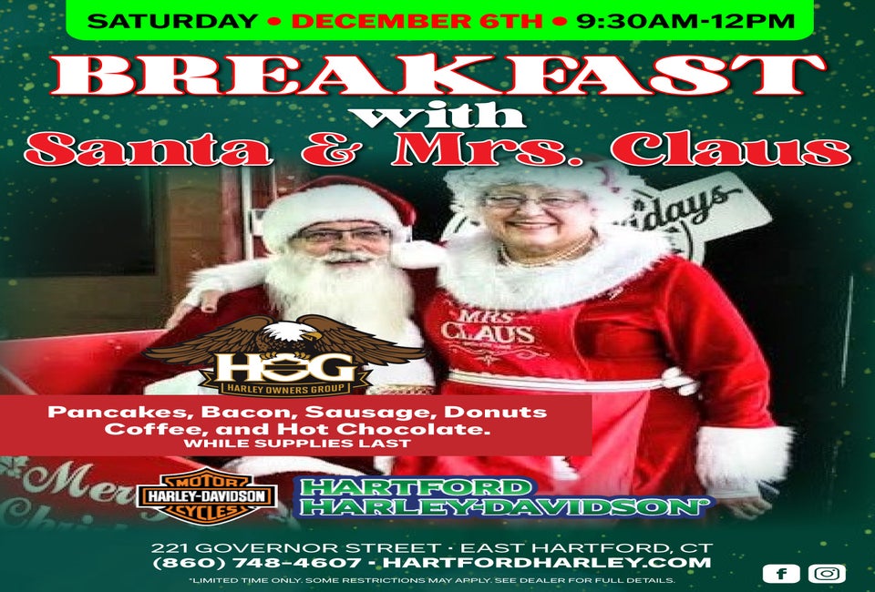 Enjoy Breakfast With Santa at Harley-Davidson! They will have pancakes, bacon, sausage, donuts, coffee, and hot chocolate.