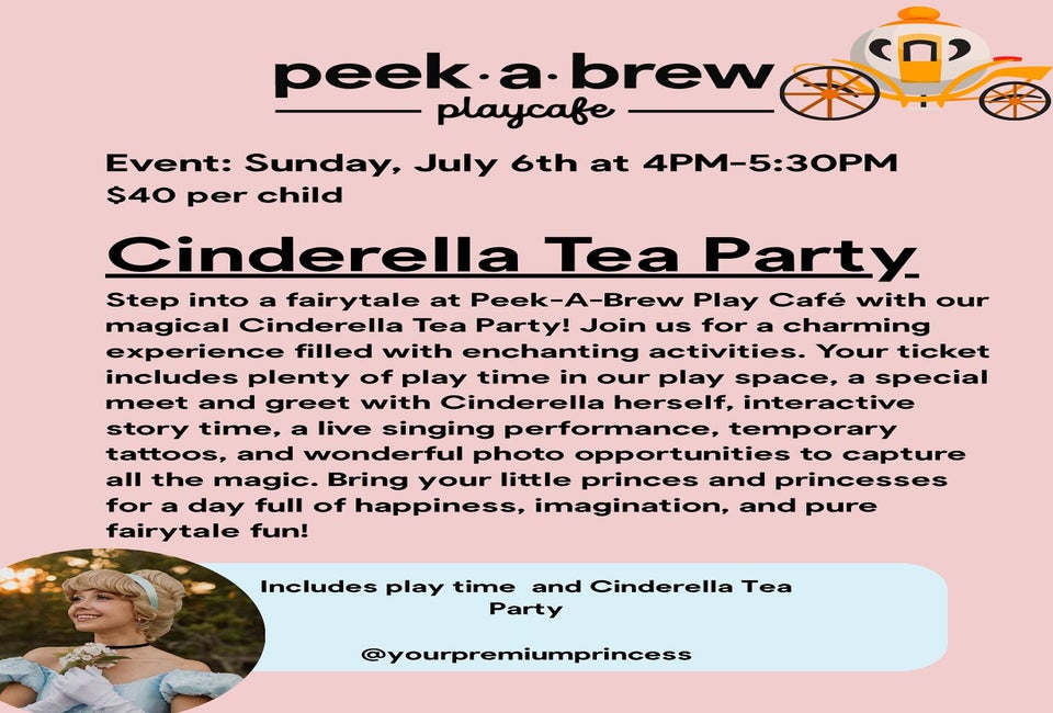 Step into a fairytale with us at Peek-A-Brew! Join Peek A Brew Play Cafe for a magical Cinderella Tea Party filled with enchanting activities.