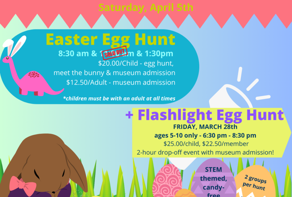 Enjoy one of EveryWonder's TWO egg hunts! The Egg Scramble (April 5) takes place during the day (in three shifts) where kids can grab STEM themed, candy-free eggs. If you want to try it in the DARK, the Flashlight Egg Hunt is March 28 and is especially for kids ages 5-10.
