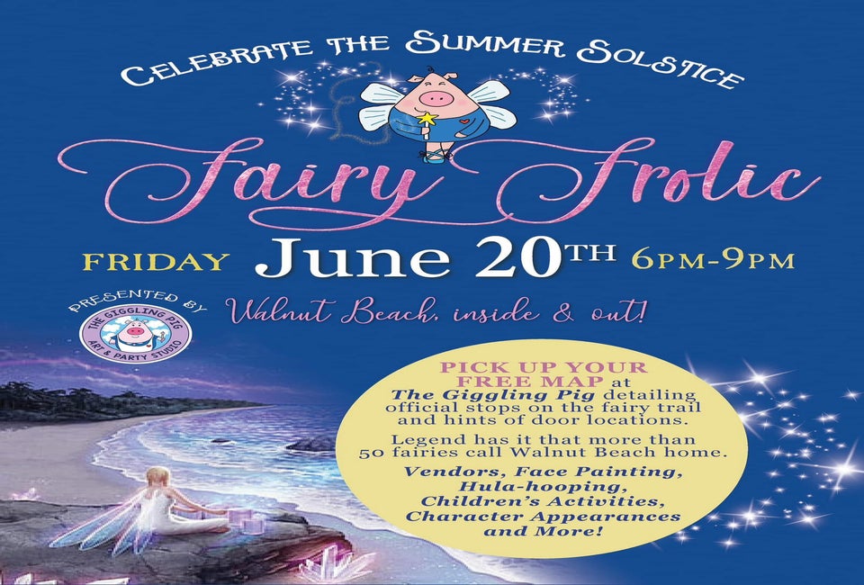 Join the Giggling Pig for an evening of family fun. Legend has it that more than 50 Fairies call Walnut Beach Home! It's a magical place where they feel safe. The summer solstice is the night when they allow you to see where they live...but only if you believe.