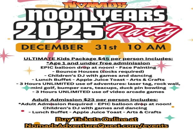 An event for all ages, Nomads Noon Years Eve Celebration! There will be face painting, a DJ, games, bounce houses, a lunch buffet, and an EPIC BALLOON DROP AT NOON! This event sells out every year- don't wait to purchase your ticket! ** All ADULTS attending MUST purchase an Adult Admission ticket. When booking, your arrival time choice will determine your lunch time. Ultimate package online only. Tickets at door do not include food or beverage **